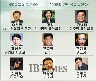 '2008 대한민국을 말한다'는 주제로 진행된 이날 토론에서는 최고의 입담을 자랑하는 유시민 전 보건복지부 장관과 방송인 김제동 이외에도 나경원 한나라당 국회의원, 전병헌 민주당 국회의원, 제성호 중앙대 법대 교수, 진중권 교수, 전원책 변호사, 이승환 변호사, 그리고 가수 신해철이 출연해 더욱 관심을 모았다.