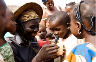 메디나충에 관한 책자를 보는 어린이들.<Credit : The Carter Center/L. Gubb>