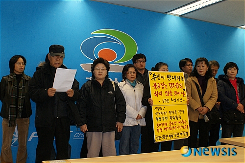 천안시민대책위 관계자 13명은 23일 오전10시 천안시청 브리핑실에서 기자회견을 열고 "천안시의 사업 시행자 지정 및 실시계획인가 고시를 받아들일 수 없다"며 "시장 항의방문을 추진하고 공사 착공시 공사중단 가처분신청 등 법적 대응도 불사하겠다"고 주장했다.