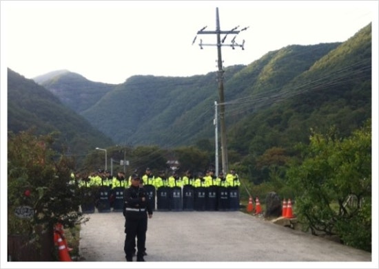 어수선한 소리에 일어나보니 경찰들은 아침부터 송전탑 공사장으로 올라가는 길을 막아 놨습니다. 한전 직원차량, 공사자재 운반차량, 번호가 확인된 주민차량만 통과시켜 주고 있었습니다. 농성장 앞에도 열명이 넘는 경찰들이 애워쌌습니다.