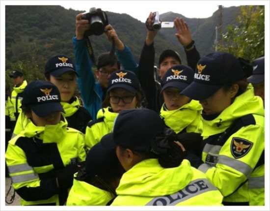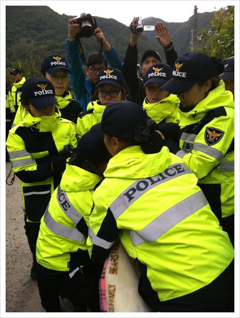 하루에도 수 차례, 십여일 넘는 기간 동안 매일 반복되어 온 일입니다. 한 시간 뒤 연행되었던 주민들이 나왔습니다. 잠시 후 경찰들의 점심시간이 되었습니다. 잠깐의 평온한 시간이 돌아온 것입니다. 농성장에도 점심식사가 도착했습니다. 송전탑 공사에 반대하는 밀양 주민들이 보내 온 것입니다. 따끈한 밥과 씨레기국, 갓 담은 김치, 호박볶음 등이 왔습니다. 점심을 먹고 있으니 진주의 한 대학교에서 대학생들이 찾아왔습니다. 간단하게 인사를 나눈 뒤 대학생들과 교대를 한 뒤 인천으로 올라왔습니다. 송전탑 공사도 말이 안 되지만, 밀양에서 가장 마음에 들지 않았던 것은 80이 넘는 노인들을 무시하며 아무렇게나 대하는고 있는 경찰들의 태도였습니다.