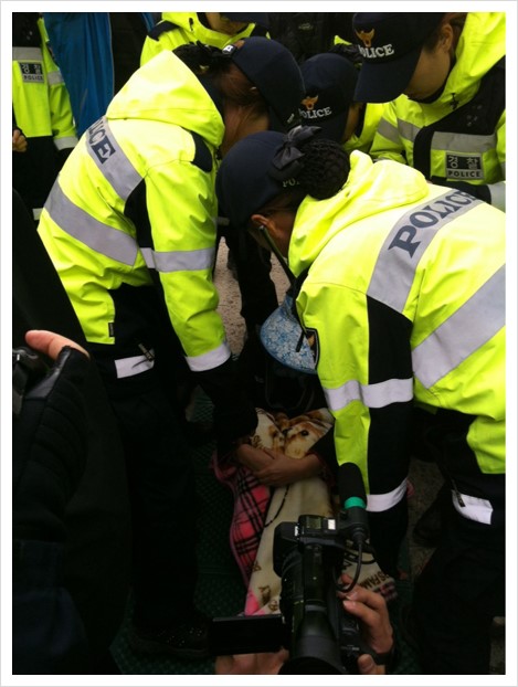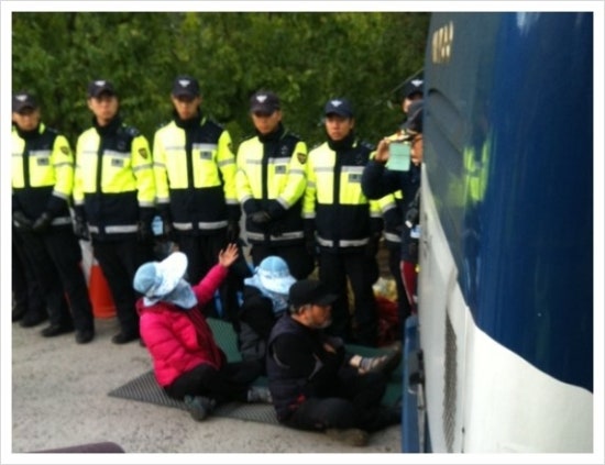 그러다 도로에 앉아있는 주민들에게 경찰버스를 들이댑니다. 버스 뒷꽁무니가 주민들 바로 코 앞에 와서 멈춰있습니다. 경찰 지휘관이 다시 스피커로 지휘를 합니다. '이 사람들 모두 도로교통법 위반이니 들어서 옮겨' 지휘관의 명령에 따라 너댓명의 경찰들이 도로에 앉아 있던 주민들의 팔과 다리를 들어 멀찍이 떨어진 곳으로 옮겨놓습니다. 경찰에 들려 옮겨졌던 주민들은 농성장 앞 도로로 와 다시 않습니다. 경찰은 다시 지휘관의 지휘에 따라 주민들을 들어 옮깁니다. 두 시간 동안 같은 상황이 계속 반복되고 있습니다.