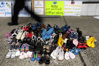 ⓒReuter=Newsis 2004년 오스트레일리아의 한 연방의원 사무실 앞에 아동 신발 80켤레가 쌓여 있다. '피난민을 위한 호주지역연대' 회원들의, 억류된 난민 어린이를 석방하라는 항의가 담겼다.